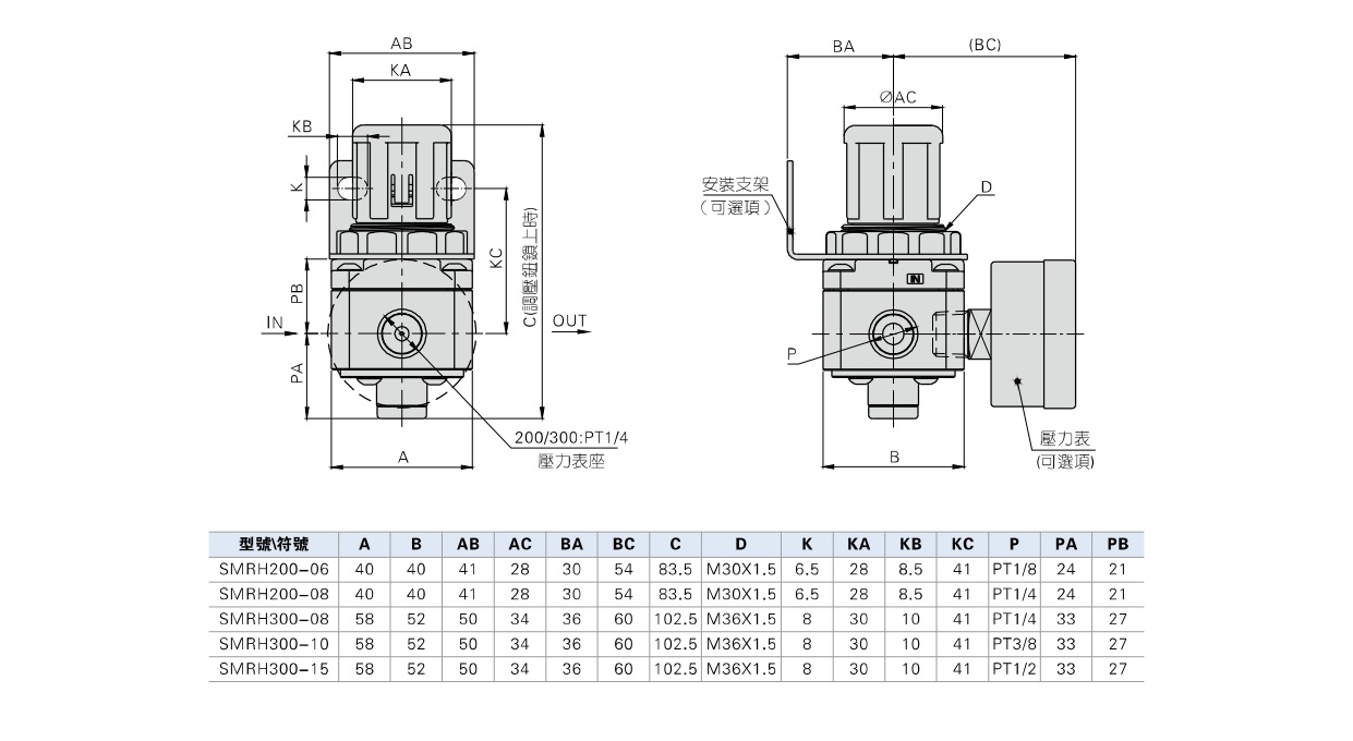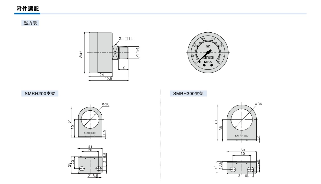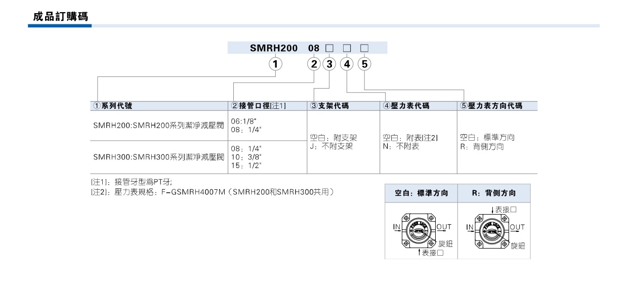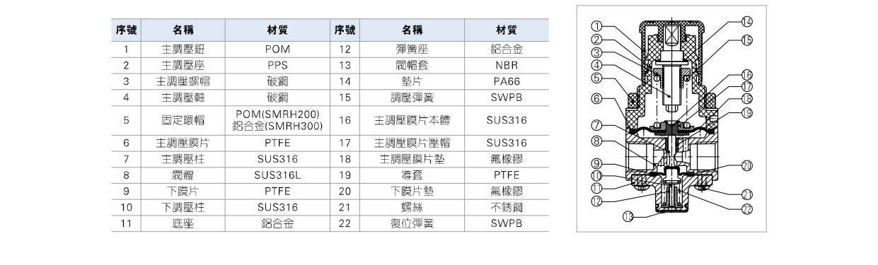 型號 SMRH200-06 SMRH200-08 SMRH300-08 SMRH300-10 SMRH300-15 工作介質 潔淨空氣 N2 純水 接管口徑 PT1/8 PT1/4 PT1/4 PT3/8 PT1/2 調壓範圍 0.05~0.7MPa 最大使用壓力 1.0MPa 保證耐壓壓力 1.5MPa 使用溫度範圍 0~60℃ (無凍結) 膜片材質 PTFE 成品訂購代碼